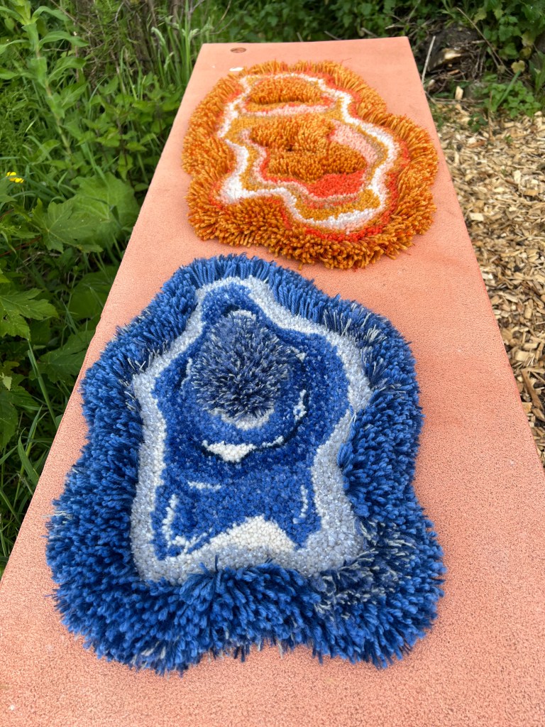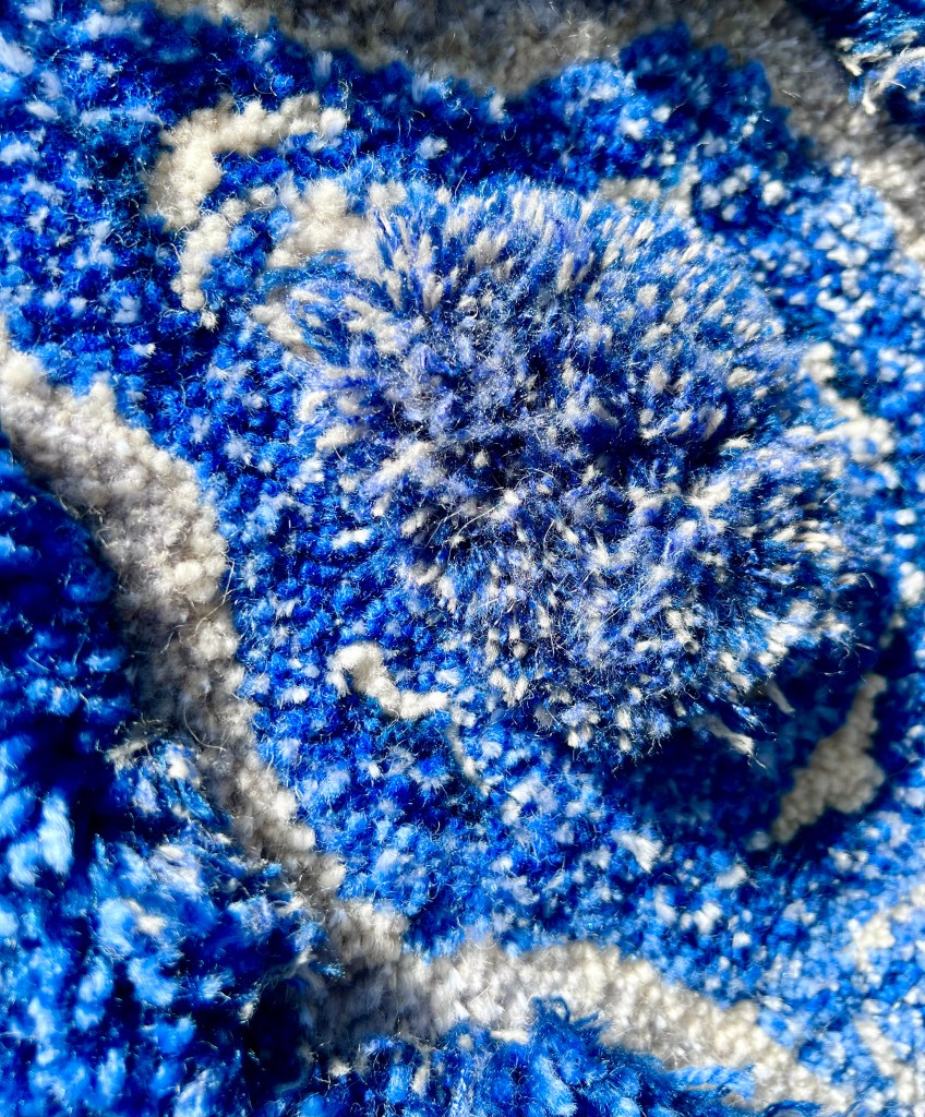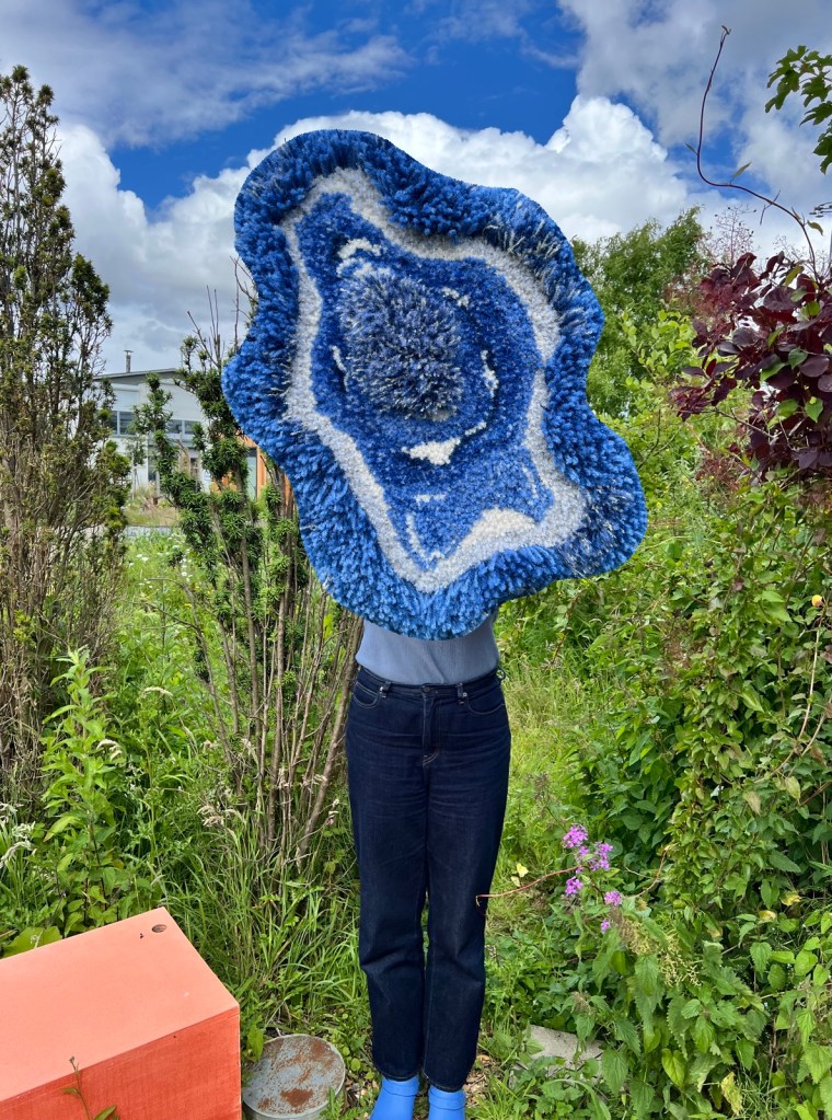 Handgetuft, gemaakt in Rotterdam, Nederland.40 x 25 cm (gemeten op wijdste punt)Gemaakt met pneumatische tufting gun en van 100% schapenwol. Dit werk heeft verschillende hoogtes en een vilten achterkant.