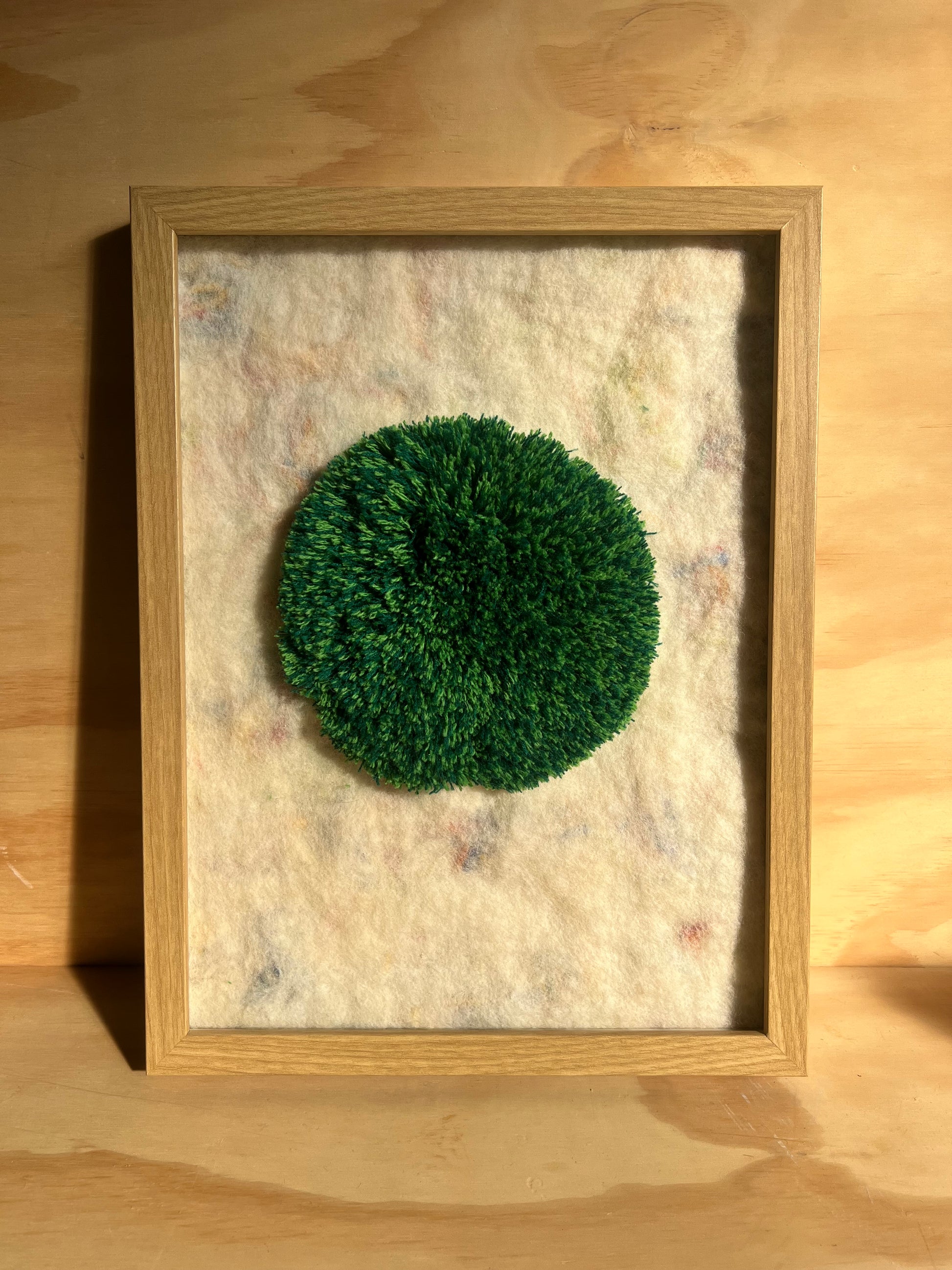 Felted part is made of 100% sheep wool and scraps of tufting yarn.