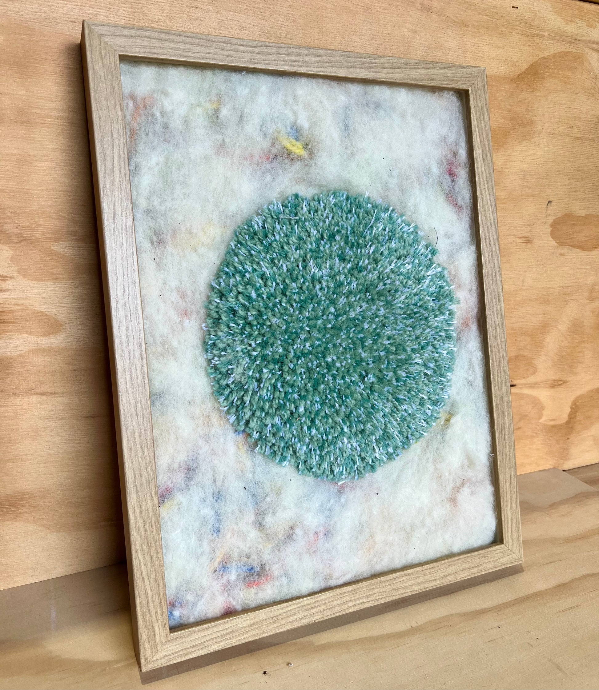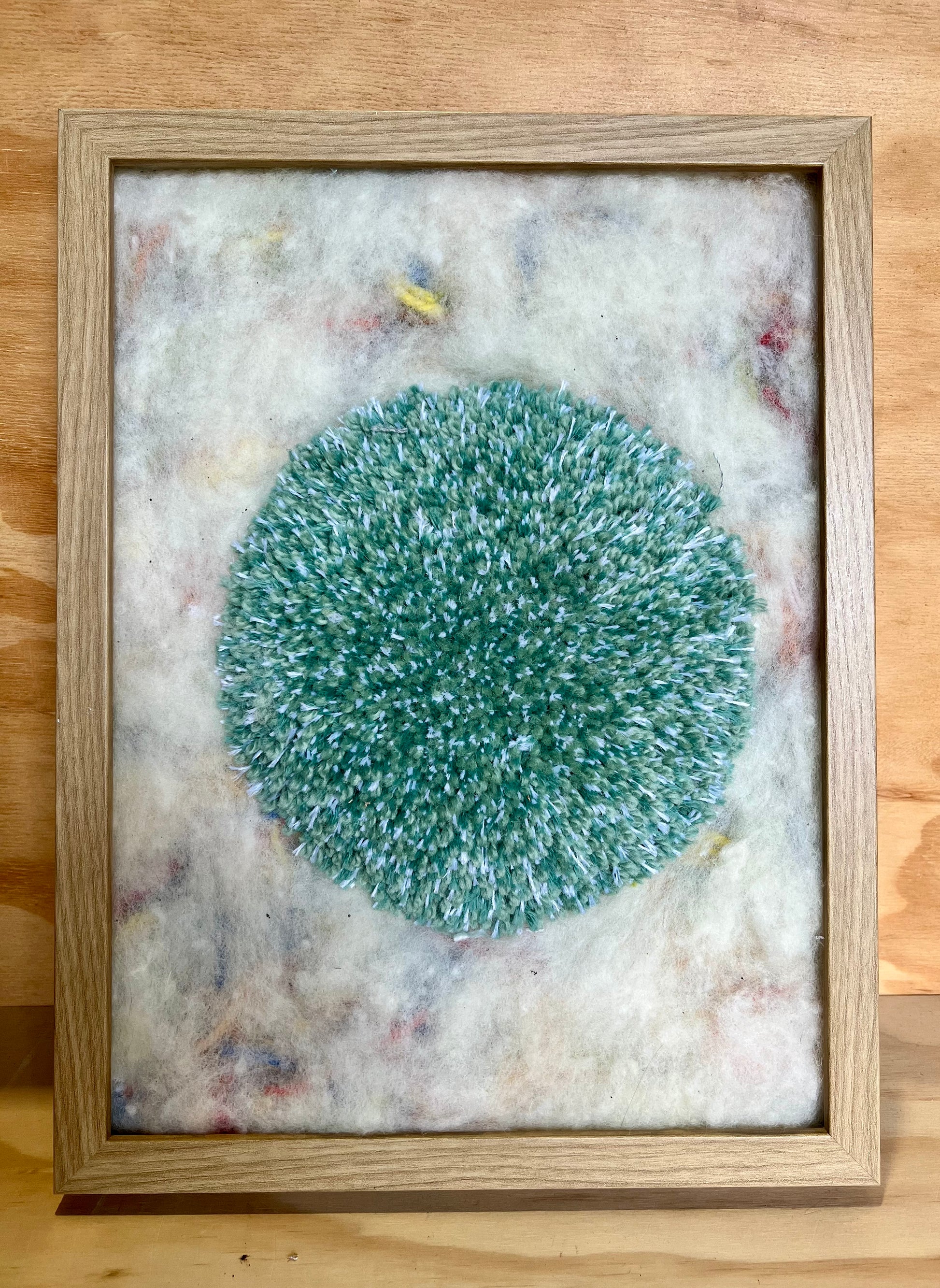 Felted part is made of 100% sheep wool and scraps of tufting yarn.